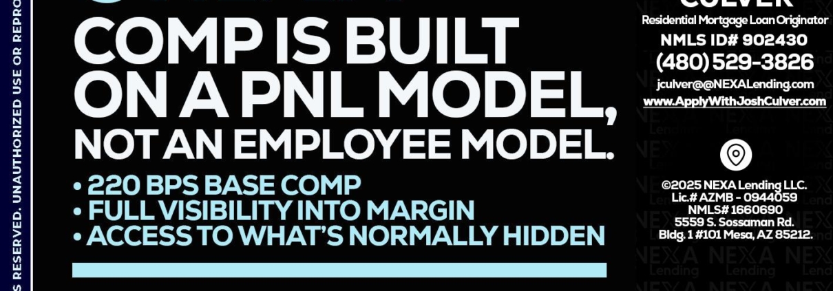 Hi, my name is Joshua Culver. I’m a Loan Officer with NEXA Lending LLC., offering personalized mortgage solutions, fast customized quotes, great rates and service with integrity.