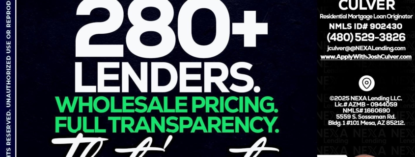 280+ LENDERS- Joshua Culver -Residential Mortgage Loan Originator & RecruiterHi, my name is Joshua Culver. I’m a Loan Officer with NEXA Mortgage LLC., offering personalized mortgage solutions, fast customized quotes, great rates and service with integrity.