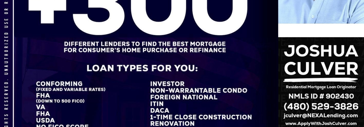 Hi, my name is Joshua Culver. I’m a Loan Officer with NEXA Lending LLC., offering personalized mortgage solutions, fast customized quotes, great rates and service with integrity.