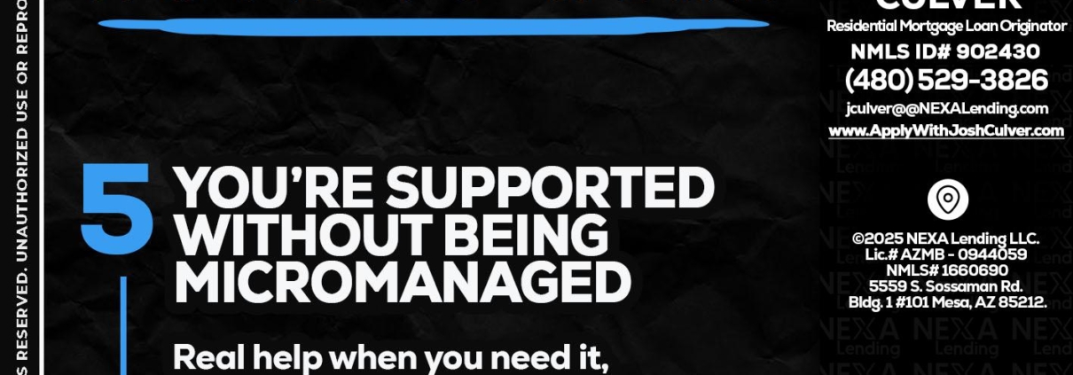 Hi, my name is Joshua Culver. I’m a Loan Officer with NEXA Lending LLC., offering personalized mortgage solutions, fast customized quotes, great rates and service with integrity.