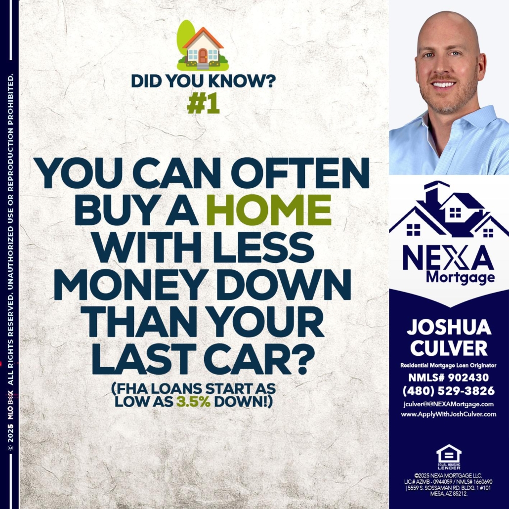 Hi, my name is Joshua Culver. I’m a Loan Officer with NEXA Mortgage LLC., offering personalized mortgage solutions, fast customized quotes, great rates and service with integrity.