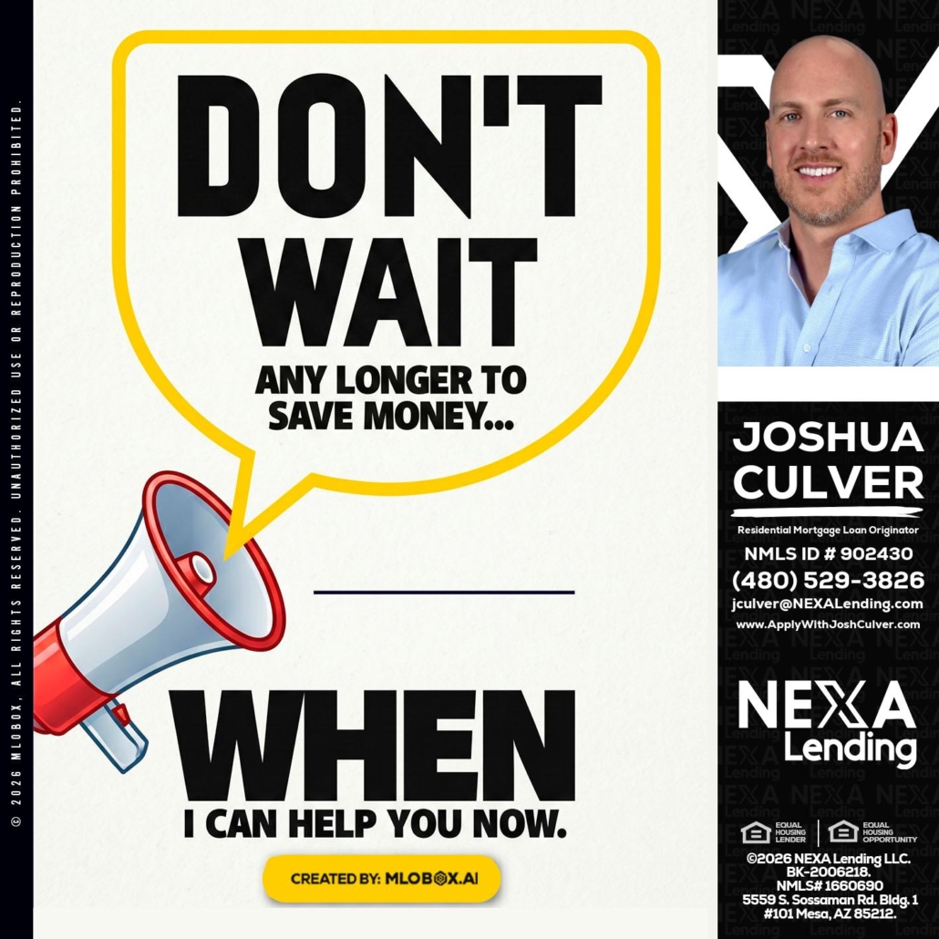 DONT WAIT - Joshua Culver -Residential Mortgage Loan Originator & RecruiterHi, my name is Joshua Culver. I’m a Loan Officer with NEXA Lending LLC., offering personalized mortgage solutions, fast customized quotes, great rates and service with integrity.