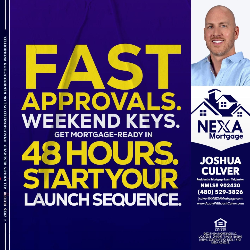 FAST APPROVALS - Joshua Culver -Residential Mortgage Loan Originator & RecruiterHi, my name is Joshua Culver. I’m a Loan Officer with NEXA Mortgage LLC., offering personalized mortgage solutions, fast customized quotes, great rates and service with integrity.
