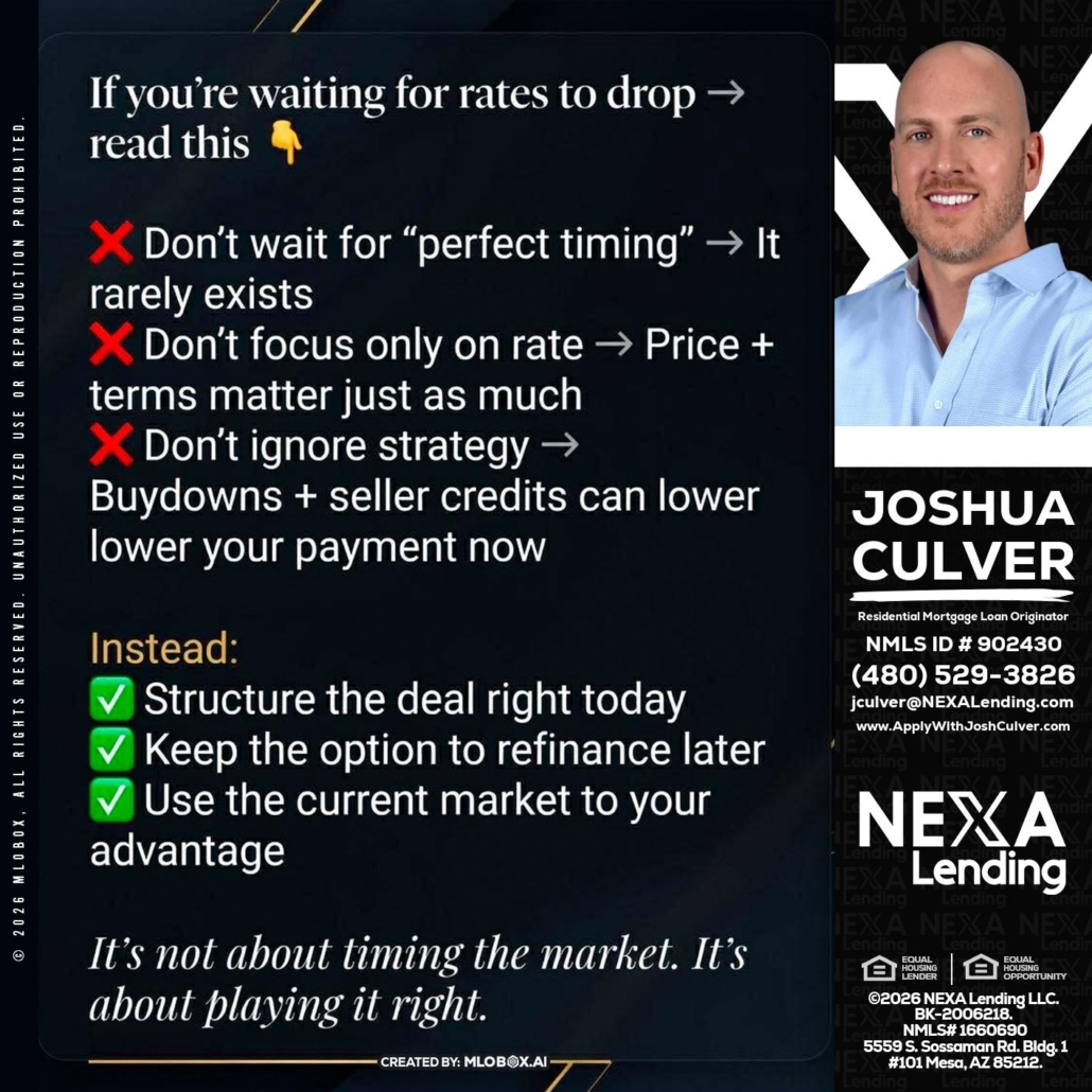 Hi, my name is Joshua Culver. I’m a Loan Officer with NEXA Lending LLC., offering personalized mortgage solutions, fast customized quotes, great rates and service with integrity.