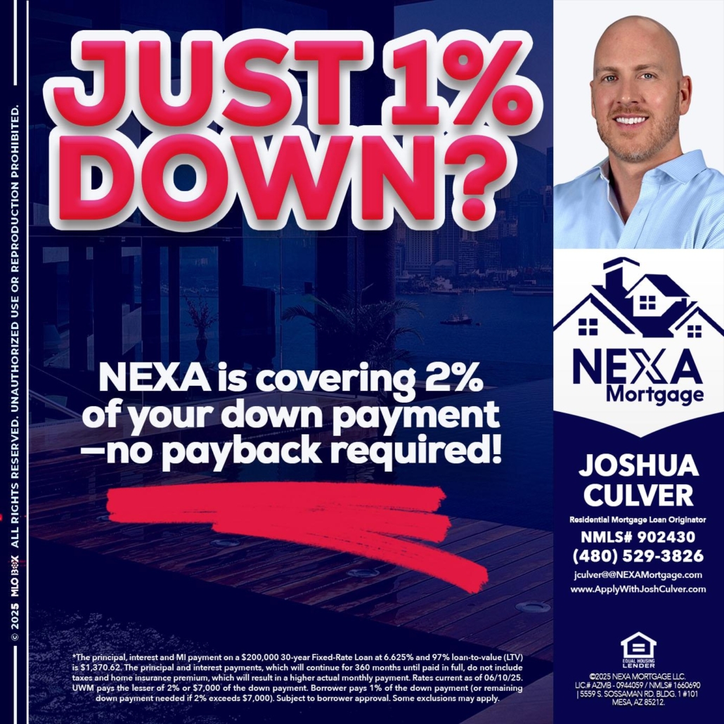 JUST 1% DOWN - Joshua Culver -Residential Mortgage Loan Originator & RecruiterHi, my name is Joshua Culver. I’m a Loan Officer with NEXA Mortgage LLC., offering personalized mortgage solutions, fast customized quotes, great rates and service with integrity.