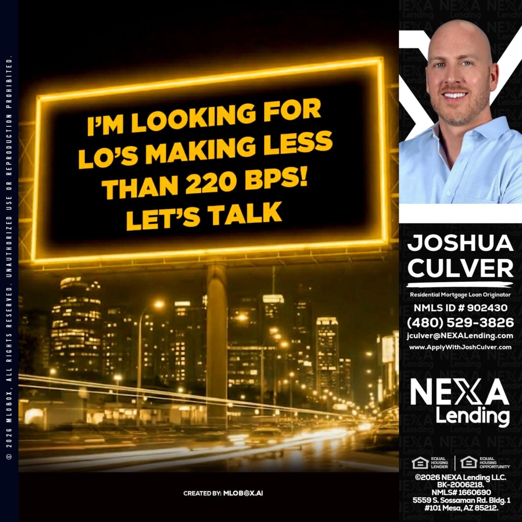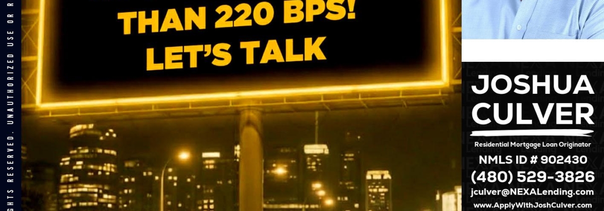 Hi, my name is Joshua Culver. I’m a Loan Officer with NEXA Lending LLC., offering personalized mortgage solutions, fast customized quotes, great rates and service with integrity.