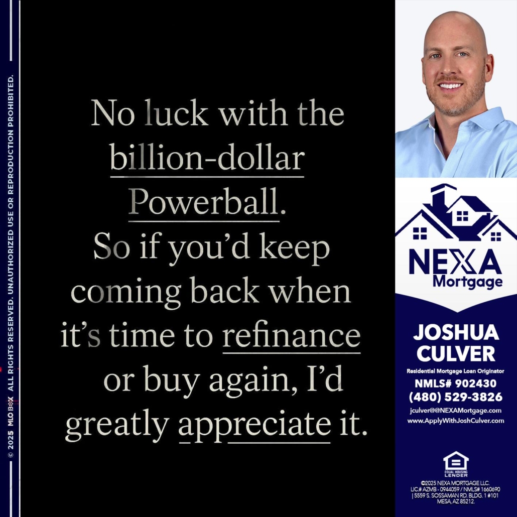 NO LUCK WITH - Joshua Culver -Residential Mortgage Loan Originator & RecruiterHi, my name is Joshua Culver. I’m a Loan Officer with NEXA Mortgage LLC., offering personalized mortgage solutions, fast customized quotes, great rates and service with integrity.