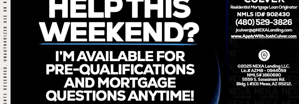 REAL ESTATE AGENTS - Joshua Culver -Residential Mortgage Loan Originator & RecruiterHi, my name is Joshua Culver. I’m a Loan Officer with NEXA Lending LLC., offering personalized mortgage solutions, fast customized quotes, great rates and service with integrity.