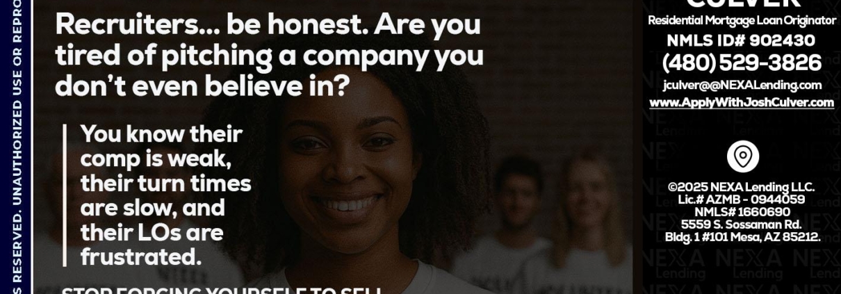 Hi, my name is Joshua Culver. I’m a Loan Officer with NEXA Mortgage LLC., offering personalized mortgage solutions, fast customized quotes, great rates and service with integrity.