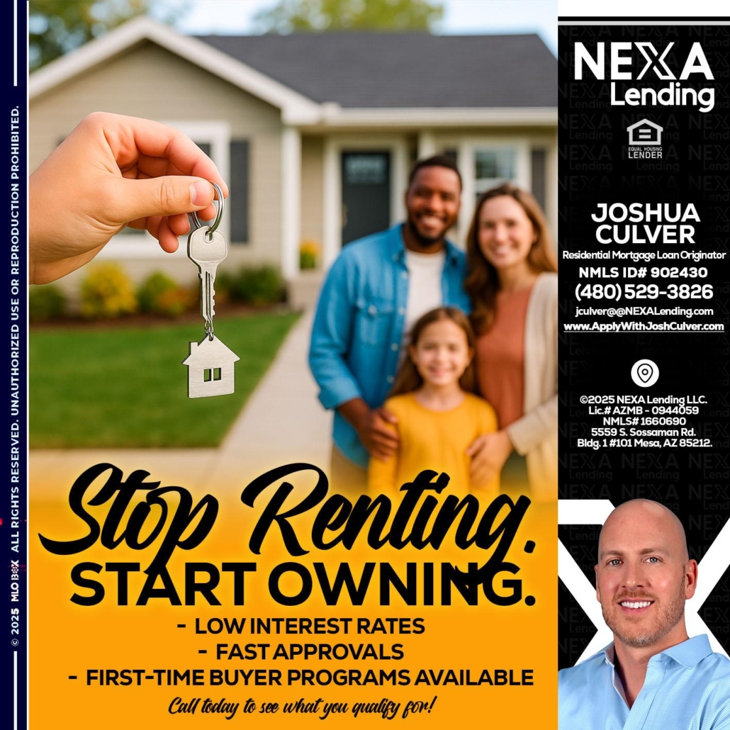 STOP RENTING - Joshua Culver -Residential Mortgage Loan Originator & RecruiterHi, my name is Joshua Culver. I’m a Loan Officer with NEXA Mortgage LLC., offering personalized mortgage solutions, fast customized quotes, great rates and service with integrity.