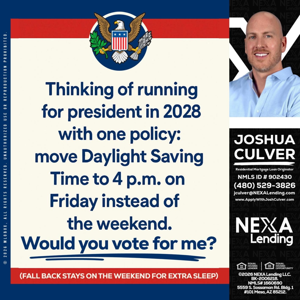 Hi, my name is Joshua Culver. I’m a Loan Officer with NEXA Lending LLC., offering personalized mortgage solutions, fast customized quotes, great rates and service with integrity.
