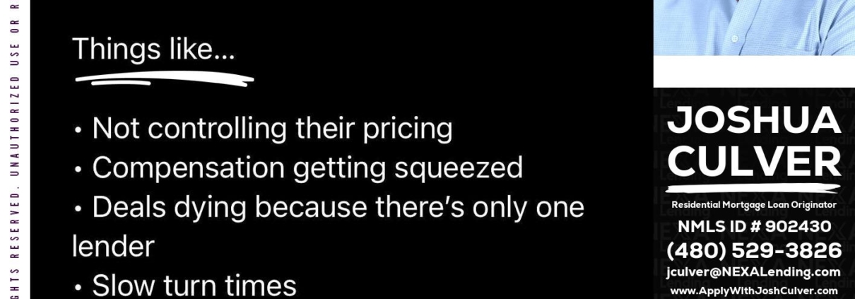 WHY NEXA - Joshua Culver -Residential Mortgage Loan Originator & RecruiterHi, my name is Joshua Culver. I’m a Loan Officer with NEXA Lending LLC., offering personalized mortgage solutions, fast customized quotes, great rates and service with integrity.