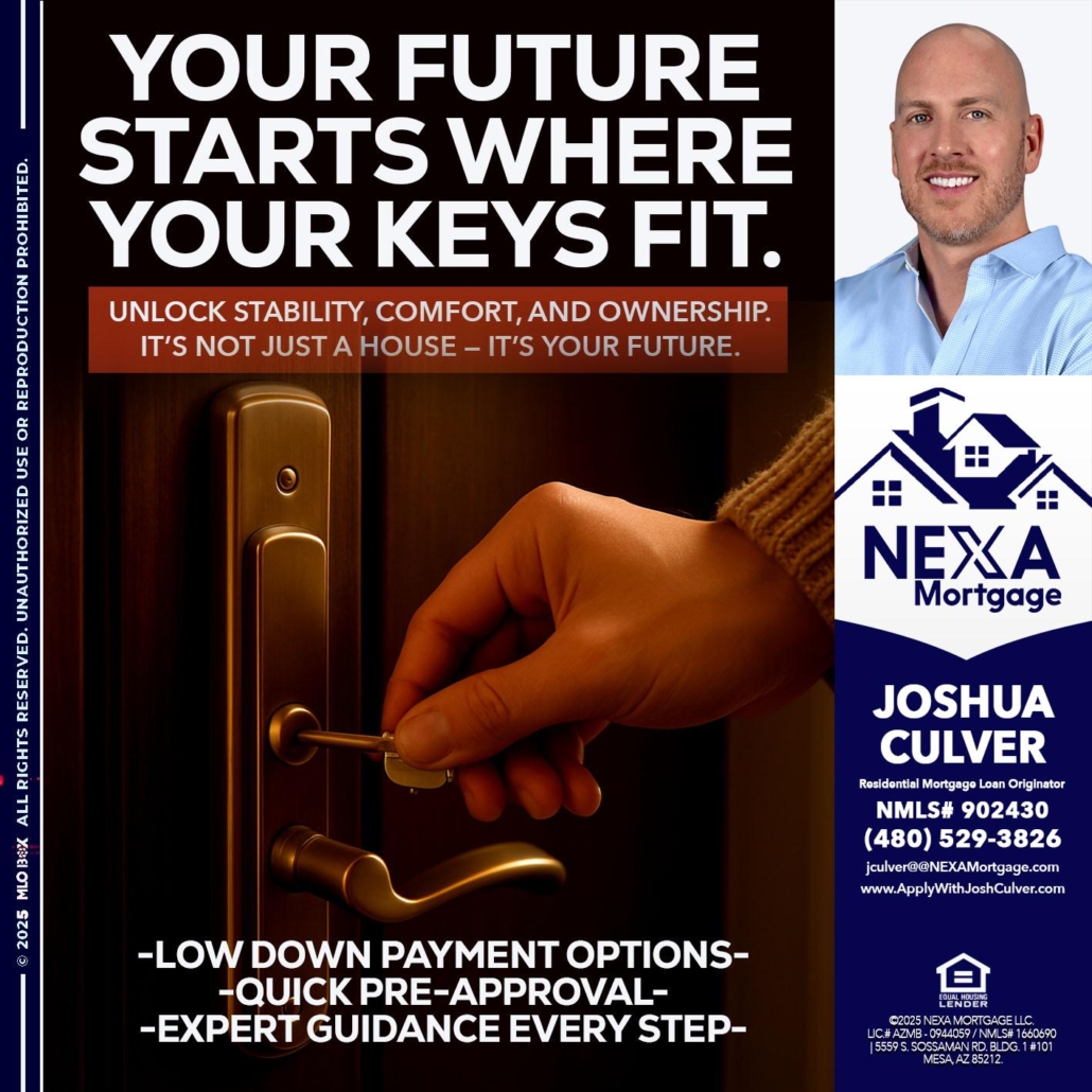 YOUR FUTURE - Joshua Culver -Residential Mortgage Loan Originator & RecruiterHi, my name is Joshua Culver. I’m a Loan Officer with NEXA Mortgage LLC., offering personalized mortgage solutions, fast customized quotes, great rates and service with integrity.